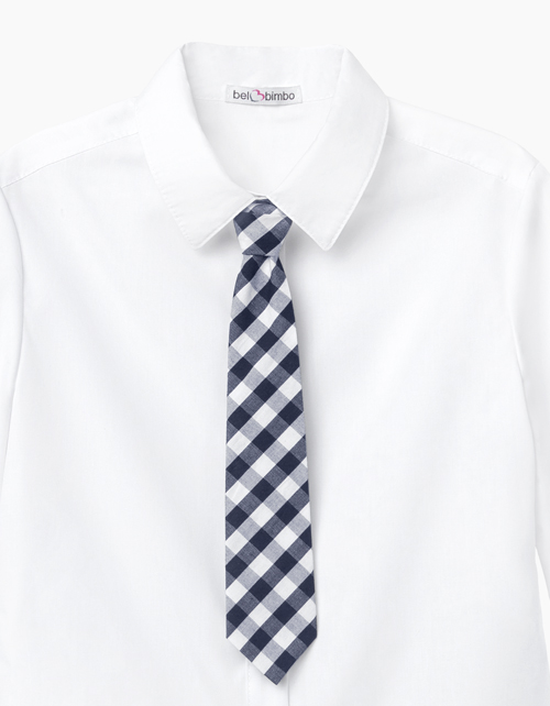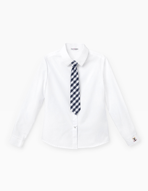 Белая блузка полуприталенного силуэта, с длинным рукавом и рубашечным воротником. С застежкой на пуговицы. Выполнена из сорочечной ткани. Декорирована фирменной вышивкой на манжете и галстуком из ткани в черно-белую клетку vichy