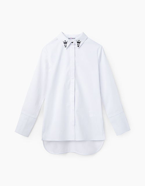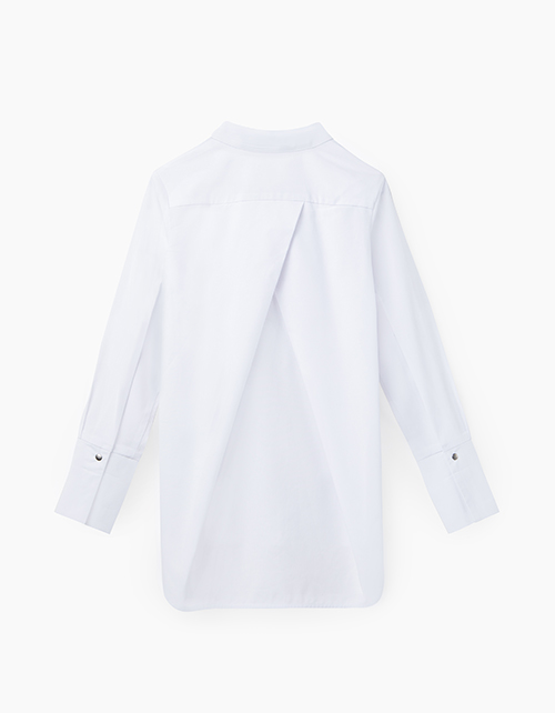 Свободная белая блузка. Рукав со сборкой по низу и высоким манжетом. Отложной воротник. Центральная застёжка потайная на сорочечные книпперы из металла. Удлиненная спинка.