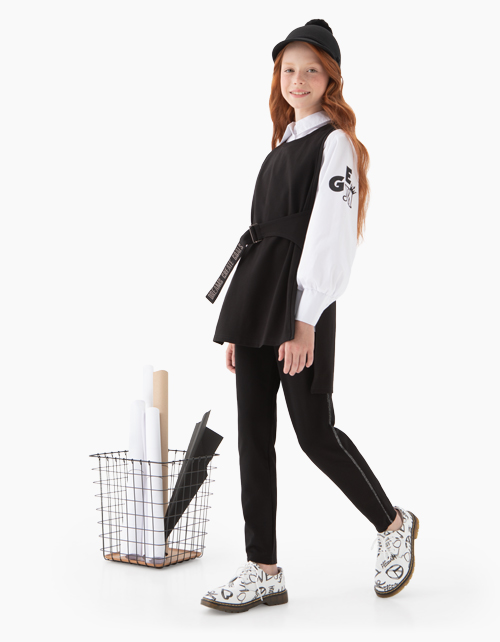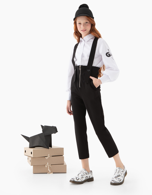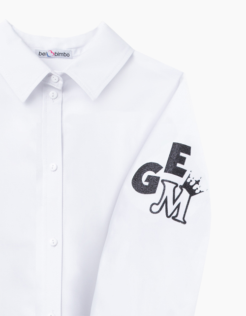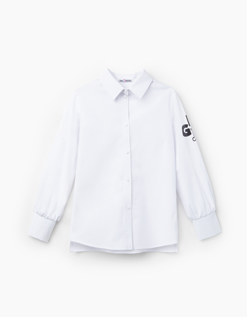 Свободная белая блузка. Рукав со сборкой по низу и высоким манжетом. Отложной воротник. Центральная застежка на пуговицах. Удлиненная спинка. По боковым швам - разрезы. На рукаве принт "GEM" (драгоценный камень) со стразами.