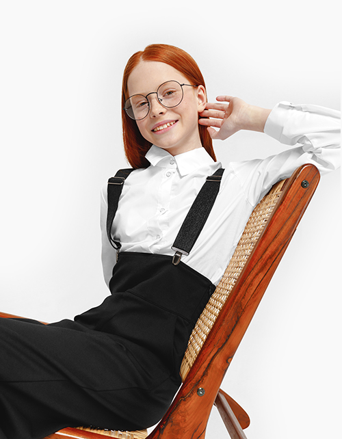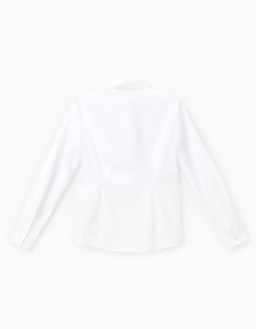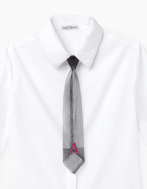 Белая блузка полуприталенного силуэта, с длинным рукавом и рубашечным воротником. С застежкой на пуговицы. Выполнена из сорочечной ткани. Декорирована фирменной эмблемой на манжете, съемным галстуком с принтом в виде буквы "А" и ажурной сеткой