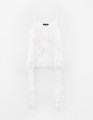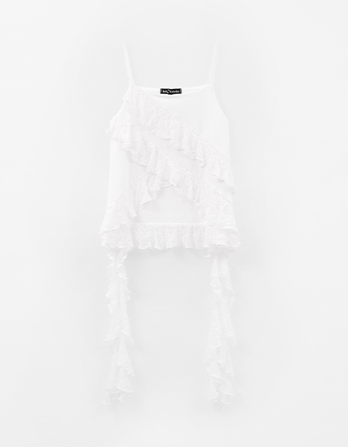 Блузка белого цвета в стиле бохо на регулируемых бретелях для девочки. Прилегающий силуэт подчёркивает посадку. Романтичные воланы из кружева. Внутри - двойной топ из кулирной глади: не просвечивает.