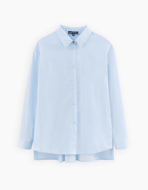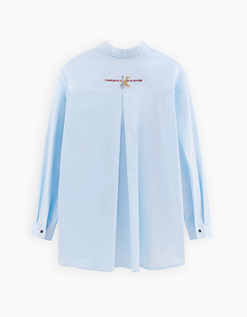 Светло-голубая школьная блузка А-образного силуэта. Удлинённая модель из поплина с разрезами в боковых швах. Изделие декорировано вышивкой.