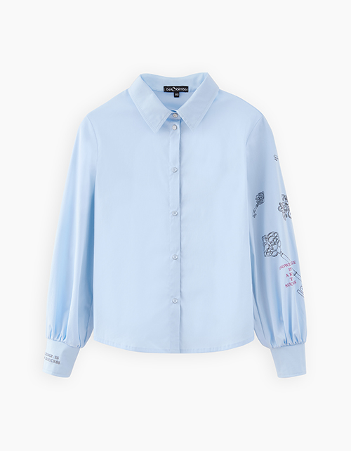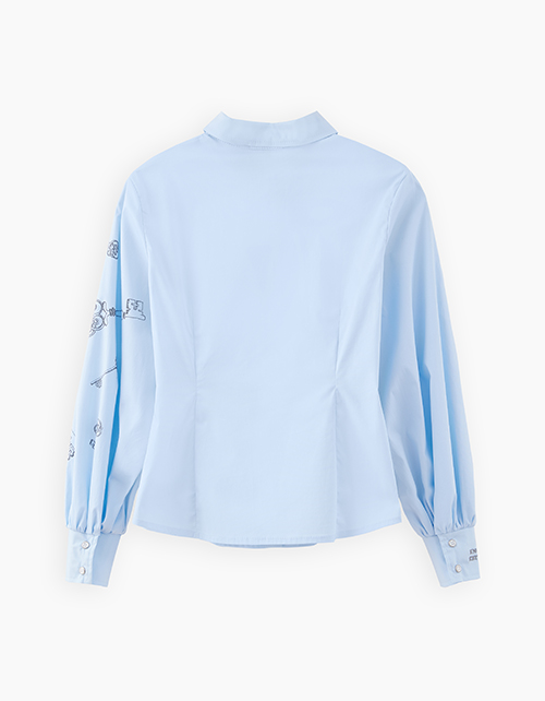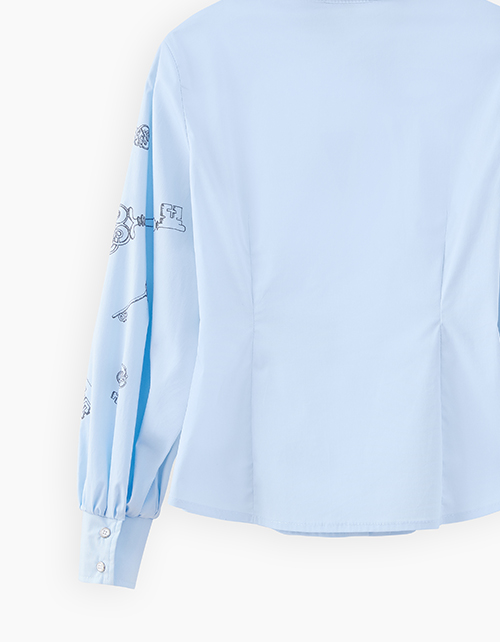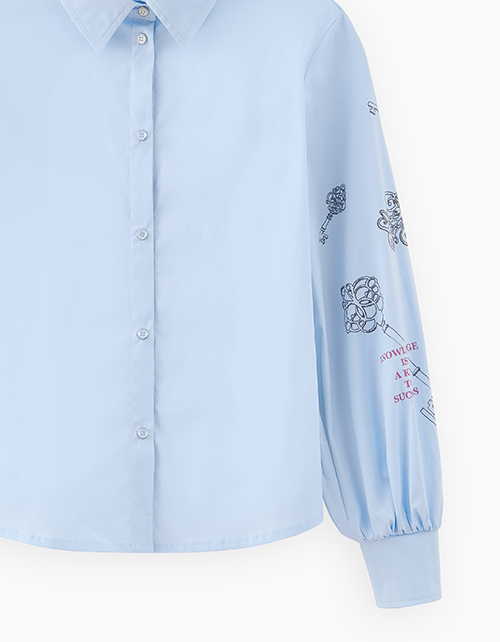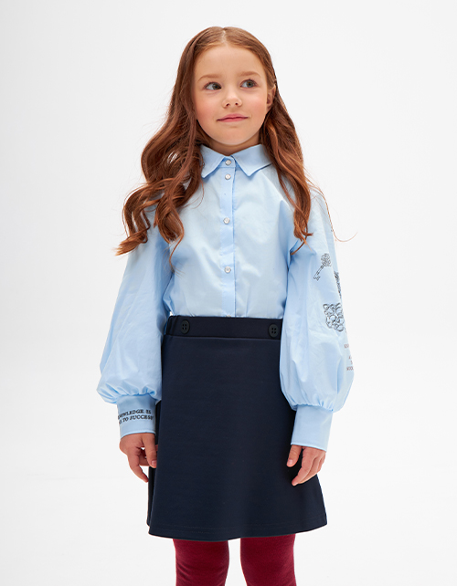 Светло-голубая школьная блузка полуприлегающего силуэта. Стильная модель из поплина. Длинный объёмный рукав с высоким манжетом. Дизайнерский принт на рукаве.