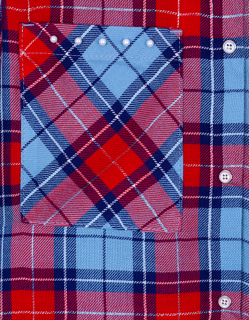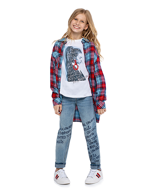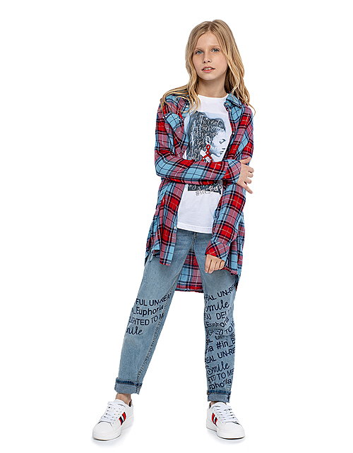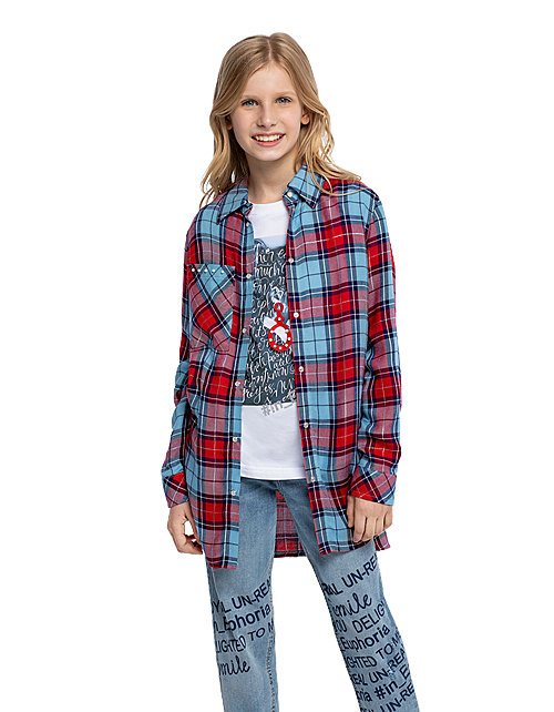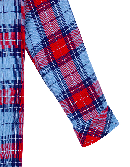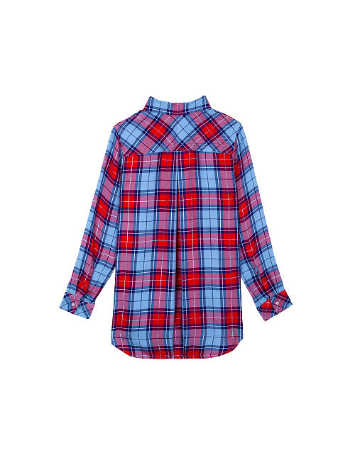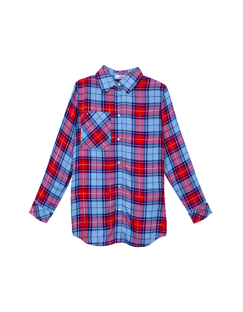Блузка для девочки свободного фасона в красно-голубую клетку дополнена рубашечным воротником, накладным карманом на груди и манжетами на рукавах. Ткань плательная вискоза с люрексом обеспечивает комфорт в носке и имеет характерный блеск.