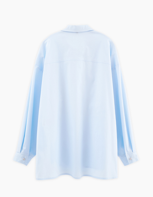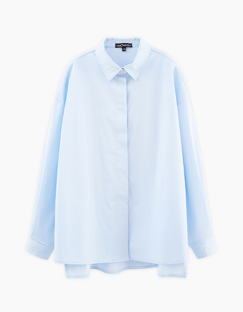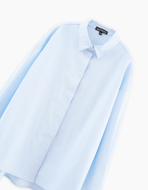 Стильная голубая блузка на кнопках для девочки. Модель прямого силуэта с удлинённой спинкой. Спущенная линия плеча. Манжеты с застёжкой на кнопки. Изделие из поплина с разрезами по бокам. Блузку можно носить полностью или частично вправив, или навыпуск.