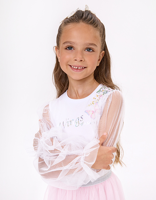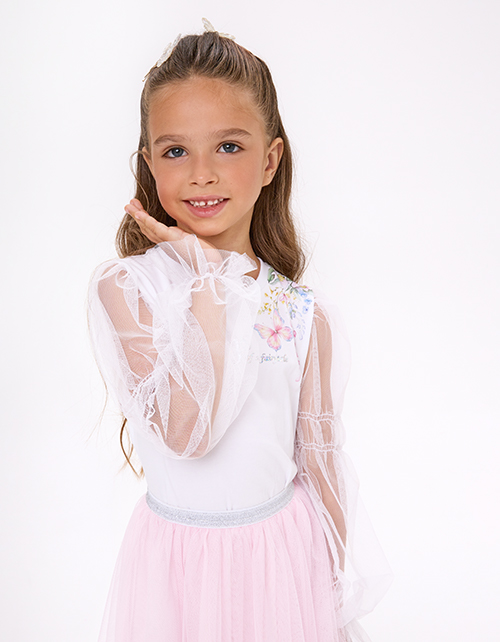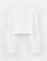 Укороченная белая блузка из кулирки и мягкой сетки. Прилегающий силуэт создаёт аккуратную посадку, воздушные рукава дают летящий эффект. Декор - цифровая флоральная печать и шрифтовая плёнка.