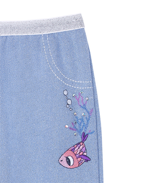 Голубые брюки для девочки с включением мягкой люрексовой нити. Оформление в стилистике "Ариэлла" дополнено стразами. Имитация боковых карманов. Резинка с люрексовой нитью.