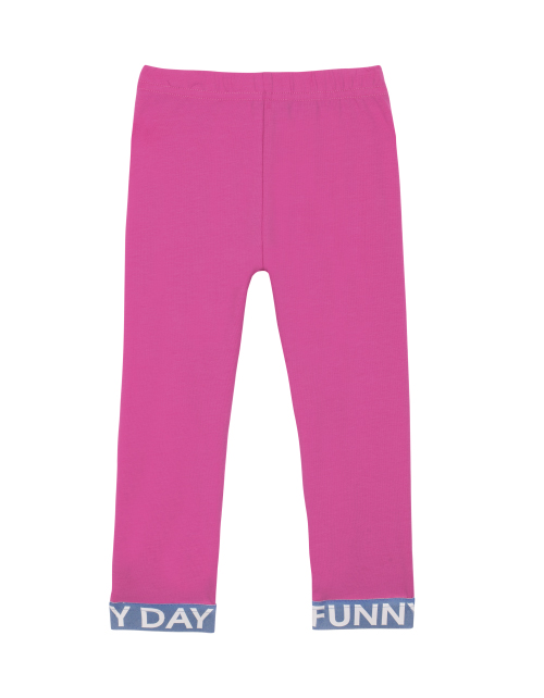Повседневные розовые брюки для девочки зауженного кроя из ткани кулирная гладь. Пояс на резинке и контрастные манжеты с принтом-надписью.