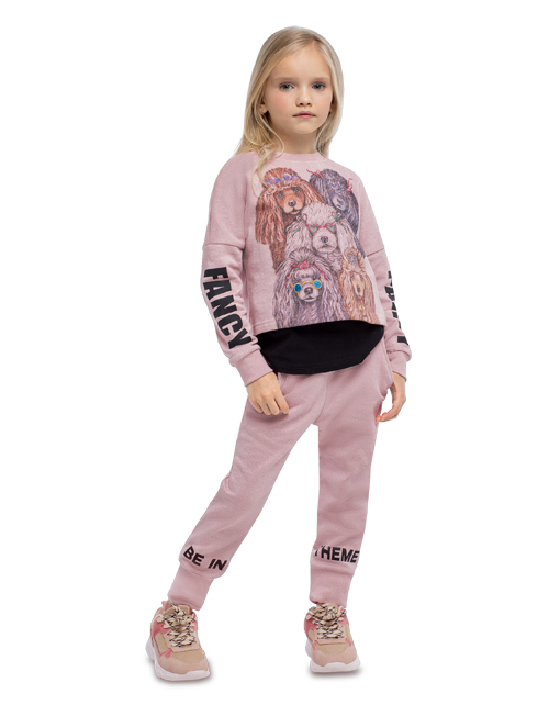 Светло-розовые брюки для девочки. Пояс и манжеты из рибаны. Карманы на лицевой стороне. Принт-надпись в стилистике капсулы "Модная тусовка".