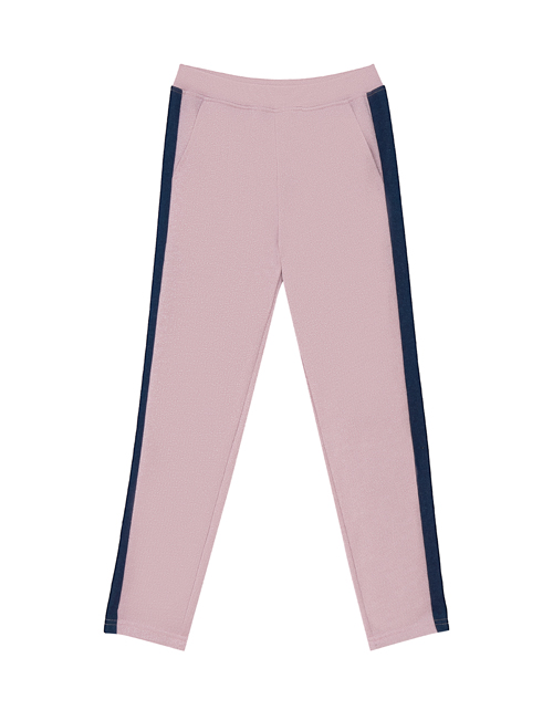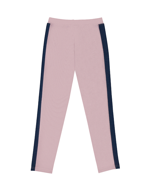 Светло-розовые брюки для девочки с мягким люрексом. Функциональные карманы по боковым швам. Лампасы из джинсовой ткани по боковым срезам. Дизайнерское оформление в стилистике капсулы "Миллион лайков".