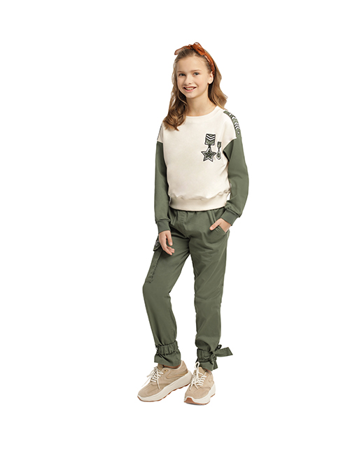 Брюки для девочки цвета хаки на резинке. Регулировка ширины штанин. Карман на лицевой стороне с дизайнерской вышивкой в стилистике капсулы "Армия стиля".