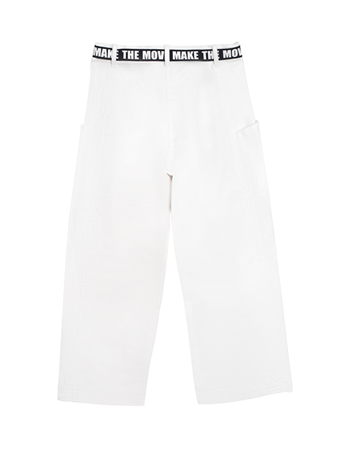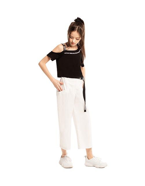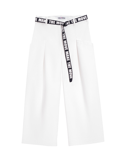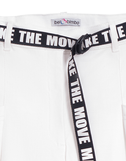 Белые укороченные брюки для девочки прилегающего силуэта. Боковые и задние карманы. Яркий пояс с застежкой в виде полукольца для регулировки по талии. Распущенный край по низу изделия. Оформление в стилистике капсулы "На своей волне".