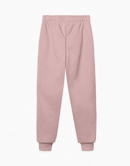 Брюки-джоггеры из комфортного футера розового цвета, с манжетами из рибаны. На поясе с эластичной лентой внутри. С карманами в боковых швах. Декорированы жаккардовой нашивкой по центру пояса спереди.