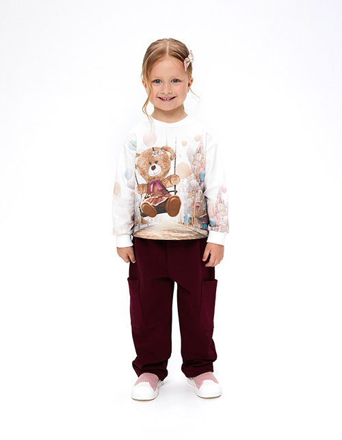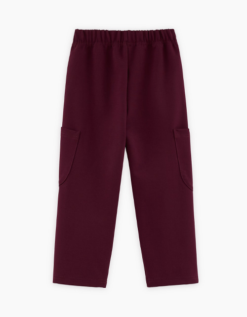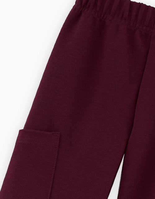 Брюки джерси благородного оттенка гранатовый сок для девочки. Прямая модель со средней посадкой. Изделие без застежки, на мягком эластичном поясе. Брюки дополнены большими боковыми накладными карманами в области колен.