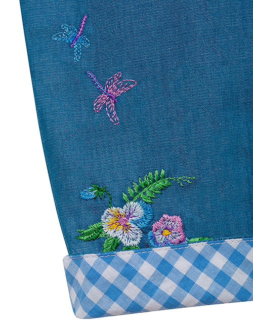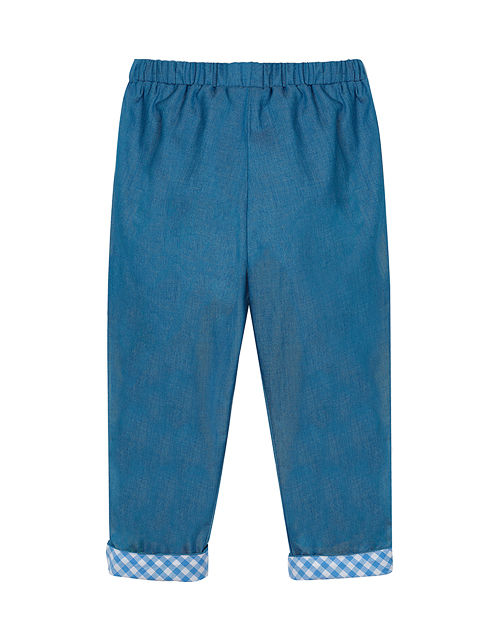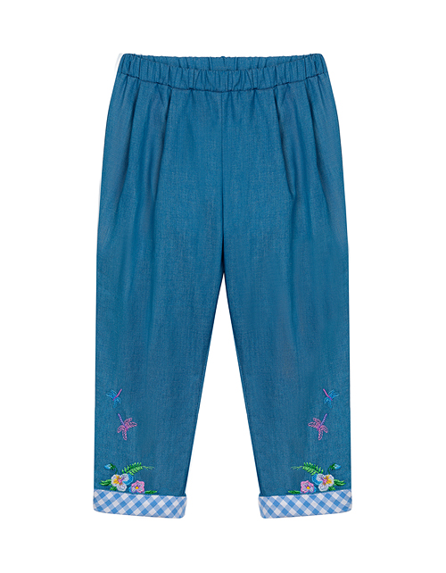 Свободные брюки из приятной натуральной ткани с модной расцветкой под джинс, сделают Вашу малышку самой стильной! В них очень удобно! Они очаровательно выглядят благодаря яркой цветочной вышивке и контрастным подворотам в клеточку