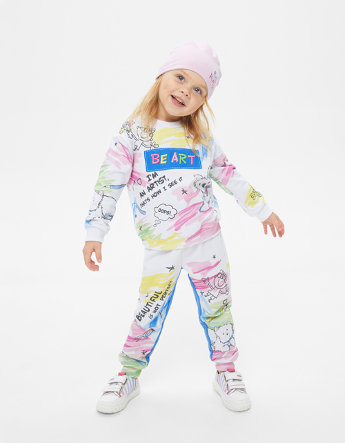 Модные брюки-джоггеры для девочки. Прямая модель, снизу на рибане, с мягким поясом. Изделие декорировано цифровой печатью, контрастной вставкой и надписью.