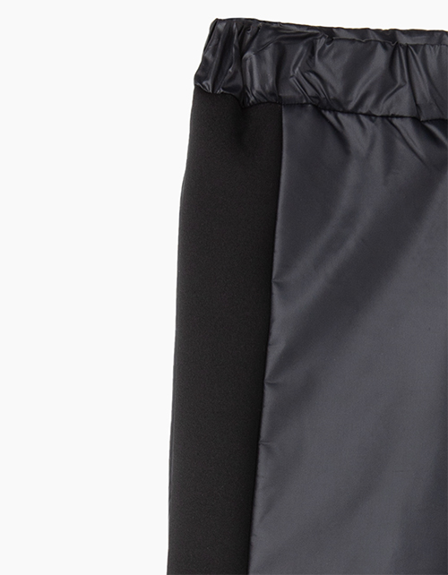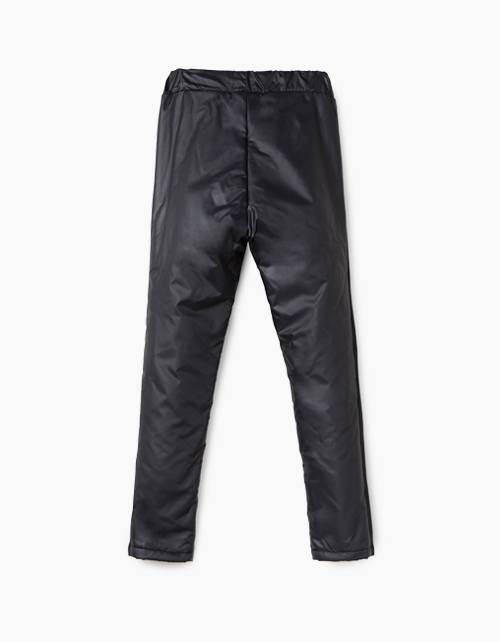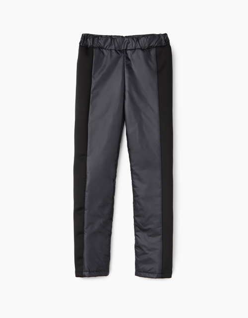 Теплые брюки модного зауженного силуэта из черной плащевой ткани для девочки. Широкий эластичный пояс. Декоративные вставки из неопрена по боковым швам для лучшего облегания и большего комфорта