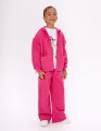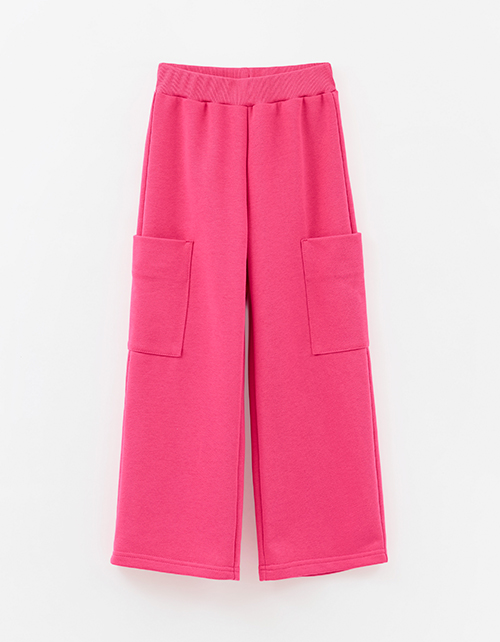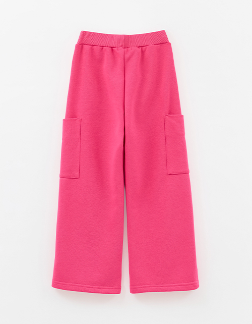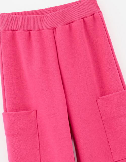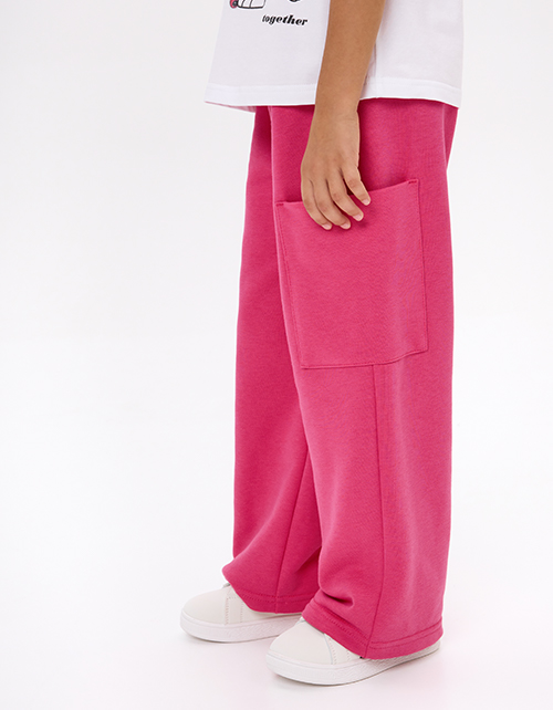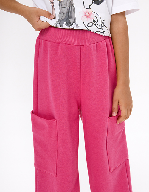 Брюки-карго оттенка фуксия для девочки. Прямой широкий силуэт и средняя посадка обеспечивают комфорт и свободу движения. Пояс из основной ткани с внутренней эластичной лентой надёжно фиксирует посадку. Накладные карманы подчёркивают утилитарный стиль.