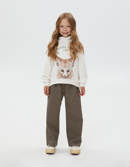 Стильные прямые брюки в клетку для девочки. Модель со средней посадкой на мягком поясе. Изделие с наклонными карманами. Брюки выполнены из плотного, мягкого и формоустойчивого трикотажного материала.