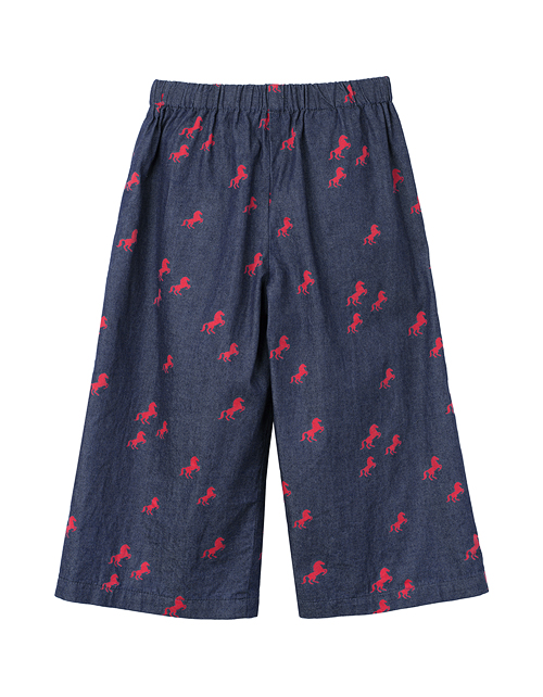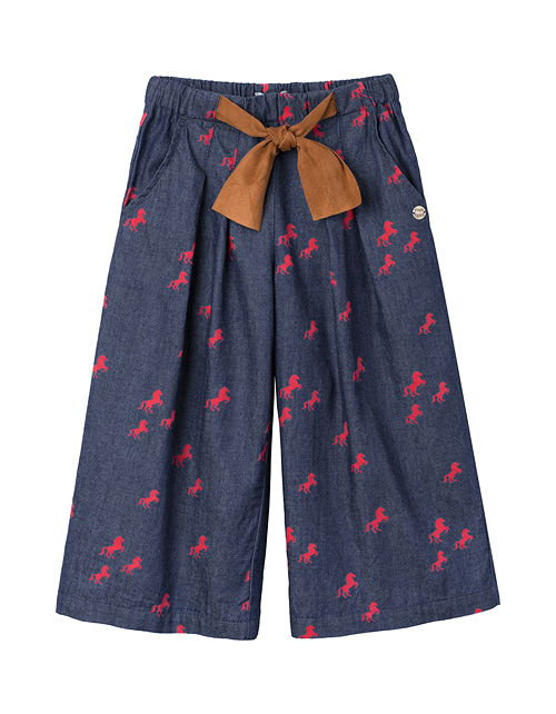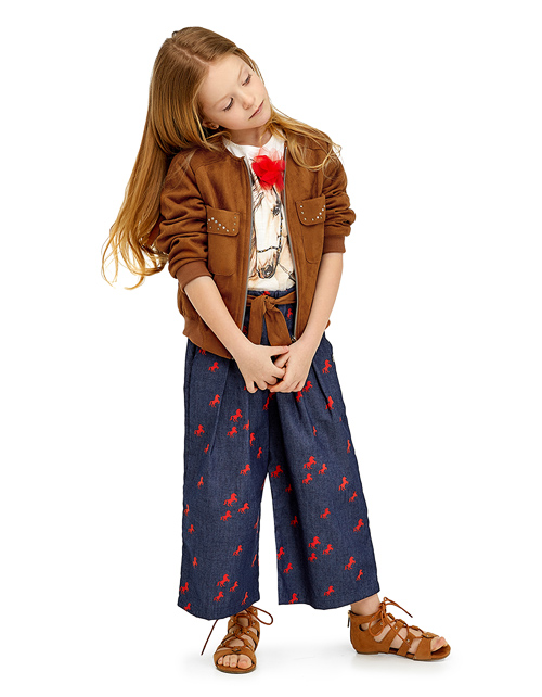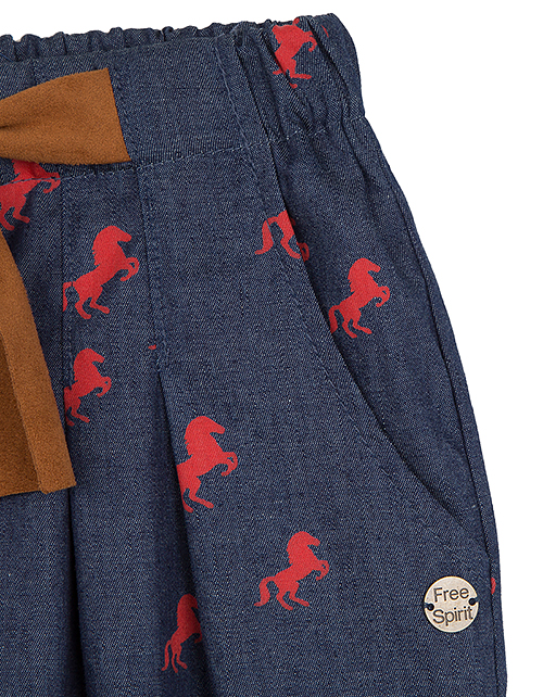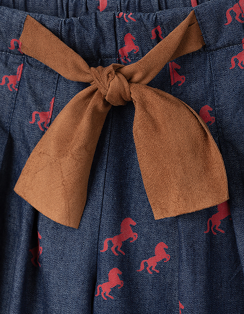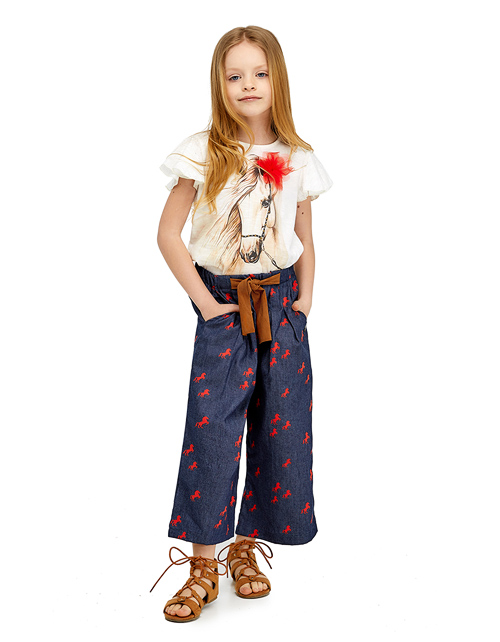 Модные кюлоты из джинсовой ткани так приятно носить жарким летом! Комфортный свободный крой не стесняет движений, а модная стилистика в духе Дикого Запада сделает Вашу девочку самой стильной! Авторские акценты: принт с лошадками и поясок из эко-замши