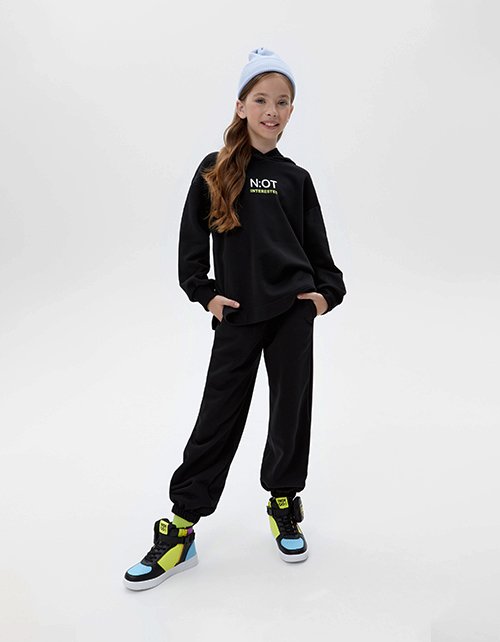 Чёрные брюки-джоггеры для девочки. Комфортная широкая модель с высокой посадкой. Изделие на мягком поясе. Карманы-хулиганы. Брюки из футера. Лаконичный шрифтовой декор с игрой на оттенках сзади.