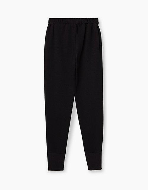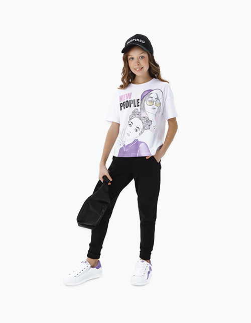 Брюки свободного спортивного силуэта с широкими манжетами для девочки. Выполнены из черного футера и рибаны. Удобные прорезные карманы по бокам, комфортный пояс на эластичной ленте. Декорированы шрифтовым трансфером из черной пленки с правой стороны