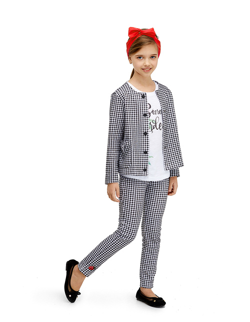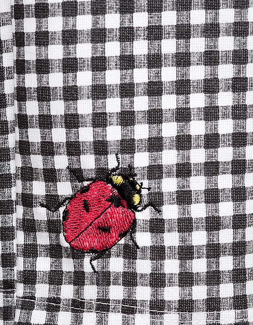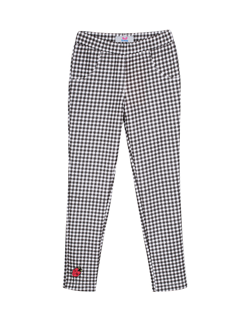 Стильные укороченные брюки отвечают последним тенденциям моды: актуальная монохромная принт клетка, изящные воланы, придающие романтичные нотки элегантной модели. Яркая деталь - милая божья коровка, отсылает к популярной природной тематике