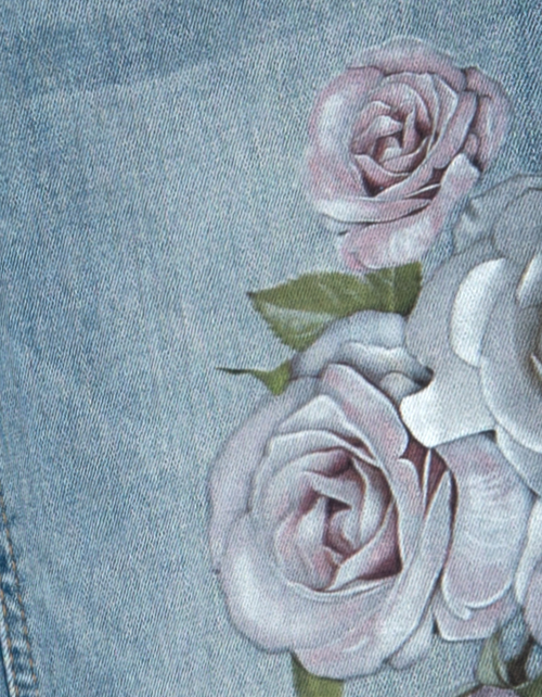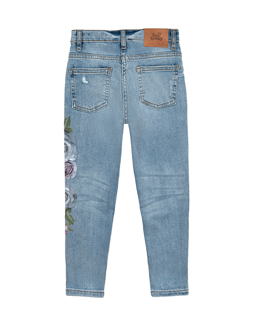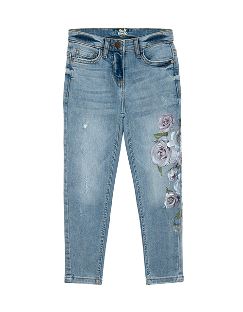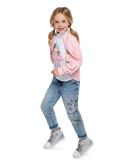 Джинсовые брюки для девочки зауженного кроя украшены стильными подворотами и нежной цветочной вышивкой. Изделие с пятью карманами имеет застежку на молнии и шлейки на поясе. Брюки комфортные в носке и выдержат много стирок без потери внешнего вида.