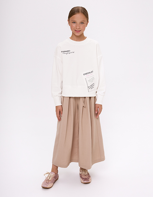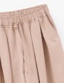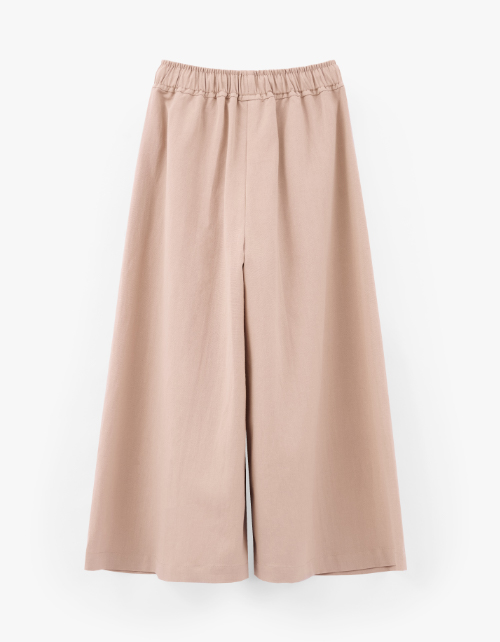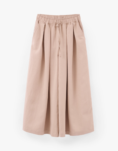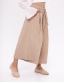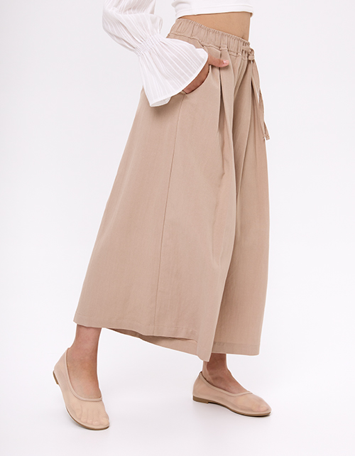 Льняные укороченные кюлоты в светло-коричневом оттенке создают расслабленный, лёгкий силуэт. Бантовые складки добавляют объёма и аккуратной формы. Длину удобно сочетать с разной обувью. Пояс регулируется мягким шнурком, чтобы посадка была комфортной.