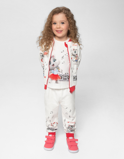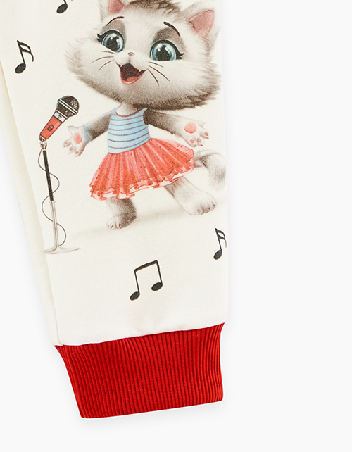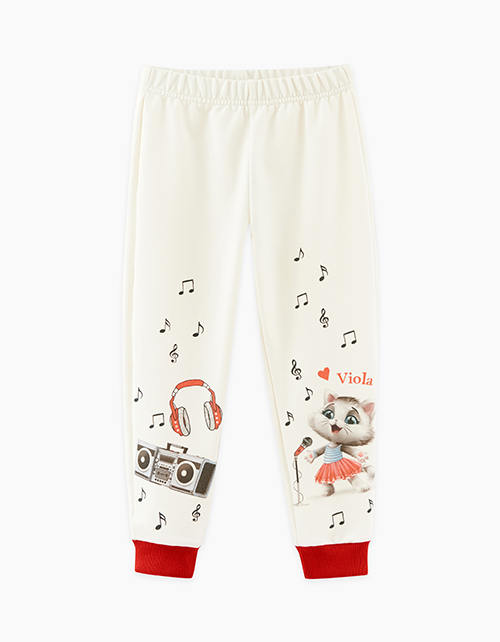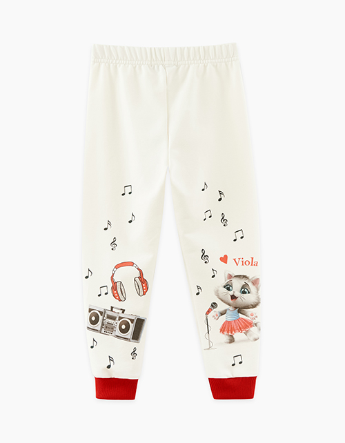 Молочные брюки-джоггеры на эластичном поясе для девочки. Зауженная модель декорирована цифровой печатью.
