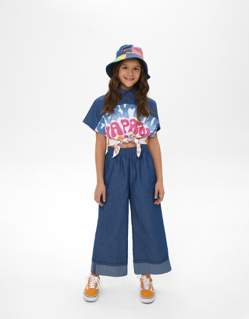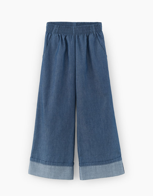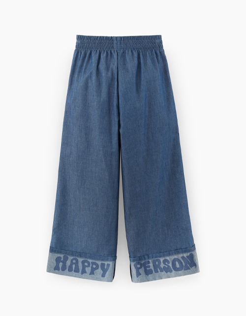 Широкие брюки в оттенке деним для девочки. Расслабленная укороченная модель со средней посадкой. Изделие с широкими декоративными отворотами. Цифровой дизайн на отворотах сзади.
