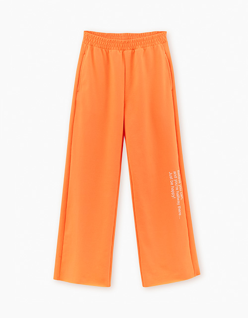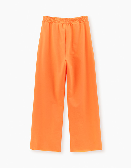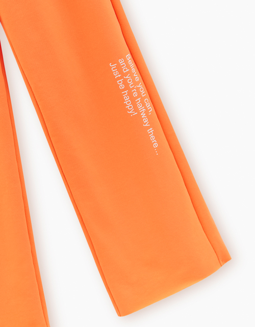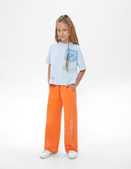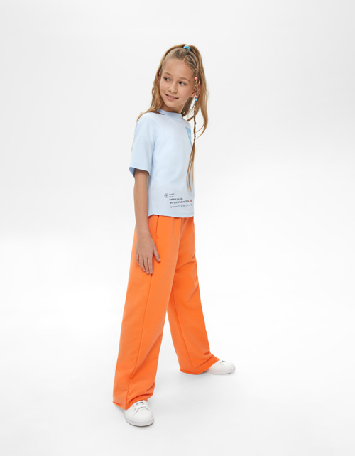 Широкие брюки сочного оттенка райский мандарин для девочки. Модель со средней посадкой имеет сырой срез по низу. Брюки из футера с браш-эффектом, что делает их мягкими и бархатистыми, повышая износостойкость.