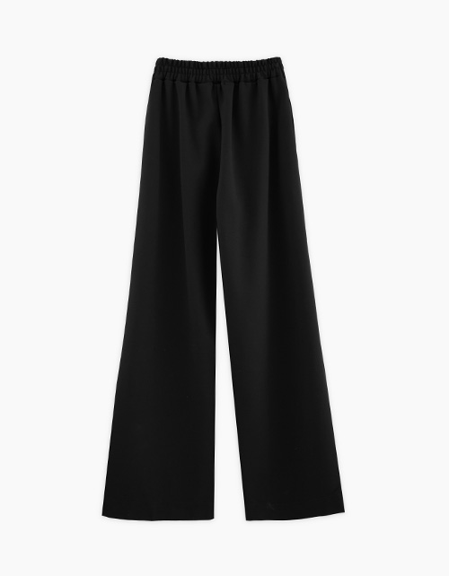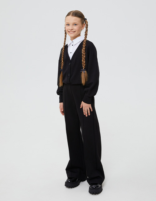 Широкие чёрные школьные брюки для девочки. Модель из трикотажного полотна. Изделие со средней посадкой, на мягком поясе с регулировкой. Карманы в боковых швах. Брюки с защипами спереди.