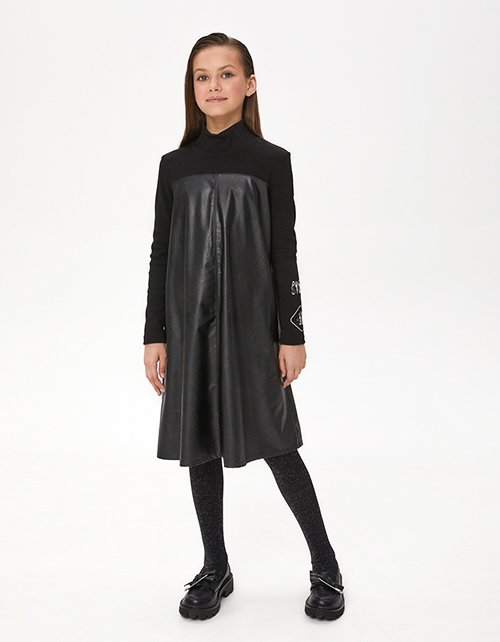 Стильные чёрные брюки для девочки. Комфортная прямая модель с высокой посадкой. Вставка из сатиновой ткани по бокам и на мягком эластичном поясе. Застёжка на потайную молнию. Брюки дополнены карманами в шве.