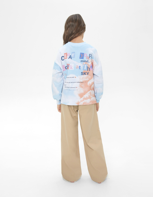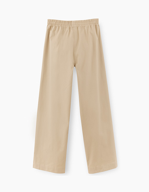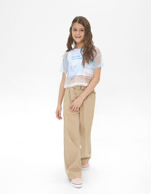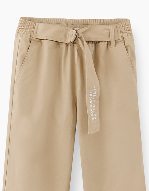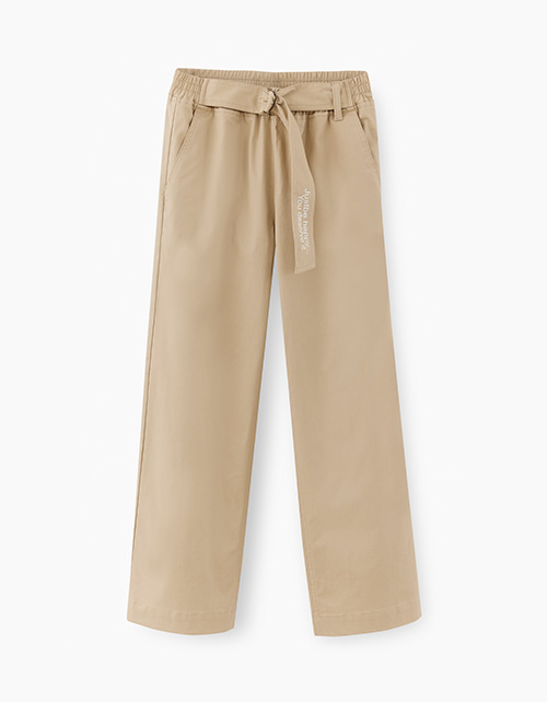 Актуальные модные светло-бежевые брюки для девочки. Прямая широкая модель из твила со средней посадкой. Элемент на поясе декорирован шрифтовой надписью. Максимально гармонично впишутся в любой гардероб.