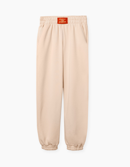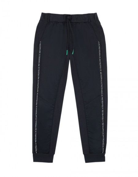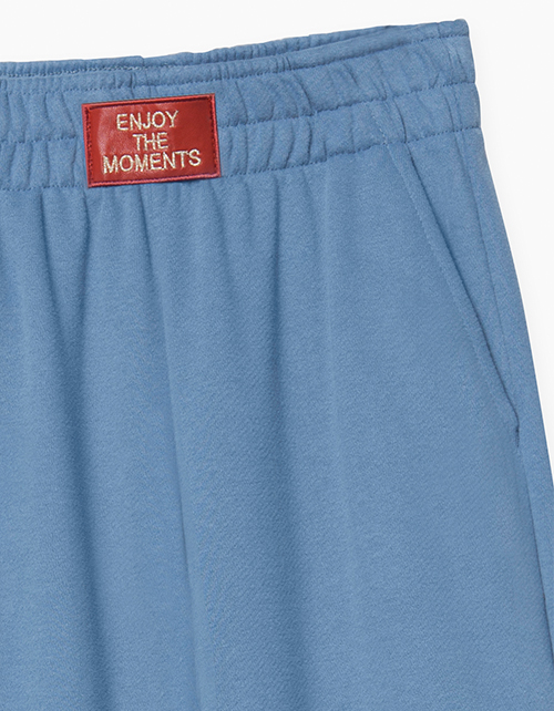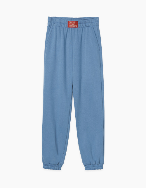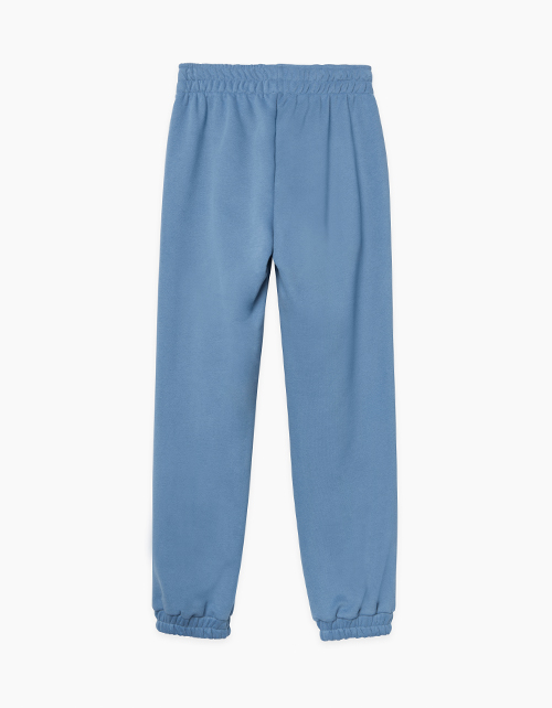 Темно-голубые брюки-джоггеры для девочки. Зауженная модель с эластичной лентой по талии и манжетам, карманами-хулиганами. Декорирована эмблемой из экокожи в центре пояса.