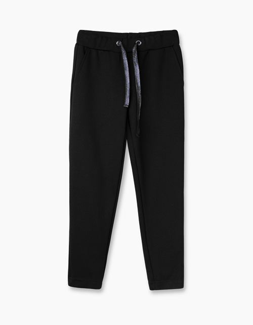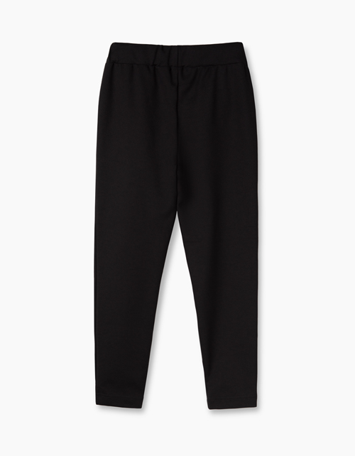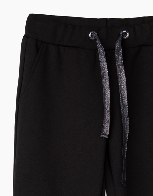 Черные зауженные к низу брюки для девочки. Эластичный пояс. Боковые карманы. Пояс внутри на эластичной ленте с дополнительной регулировкой отделочной трикотажной тесьмой. Часть лимитированной школьной капсулы.