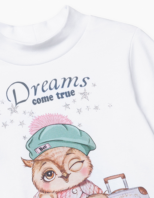 Белый лонгслив прямого силуэта. Дополнен белыми кружевными рюшами и авторским принтом.