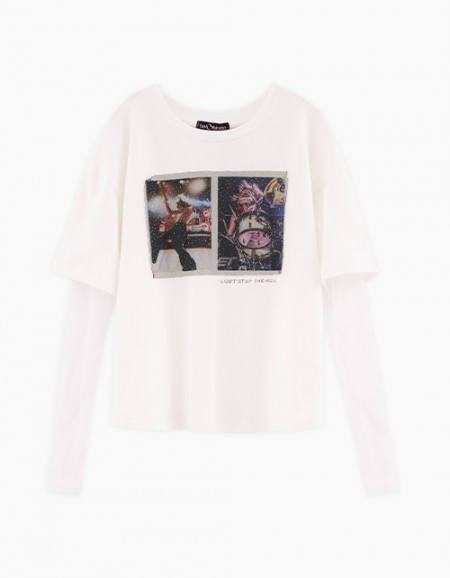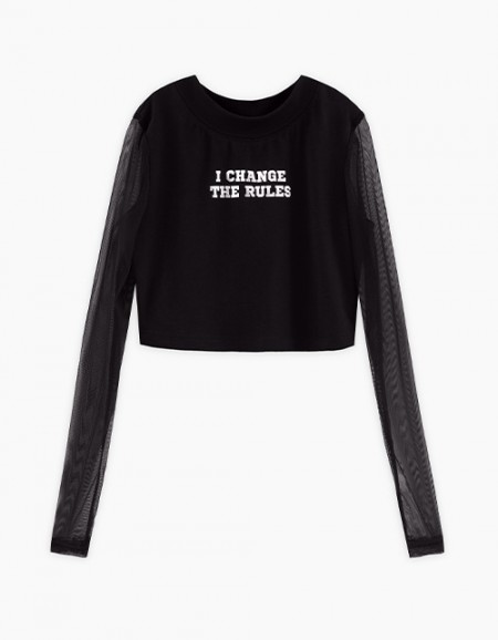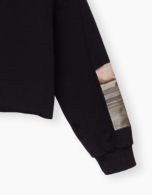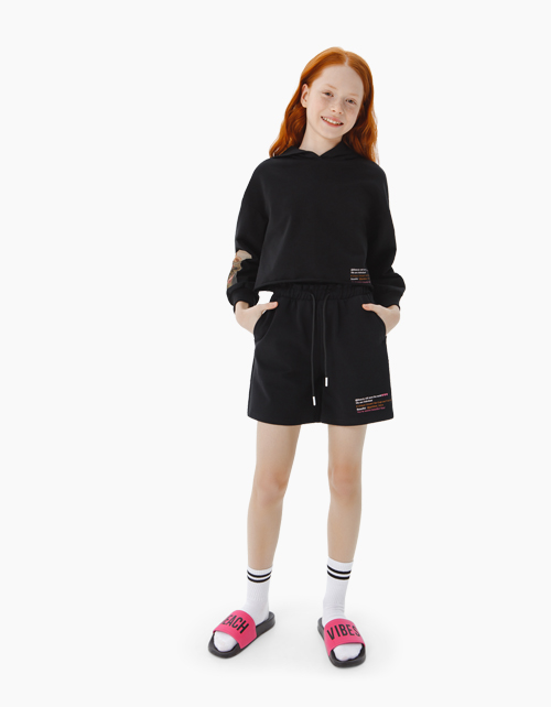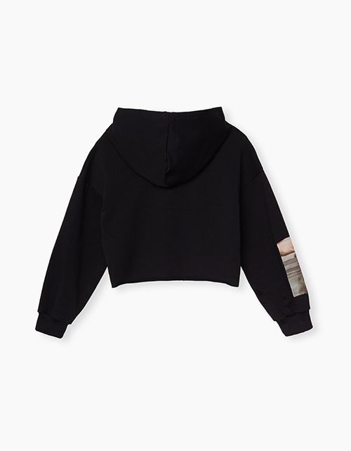 Объемное укороченное худи для девочки-подростка. Выполнено из черного футера, с манжетами из рибаны. Правый рукав декорирован нашивкой с полноцветным цветочным принтом. Текстовый принт в стилистике постов из соцсетей нанесен по нижнему краю слева