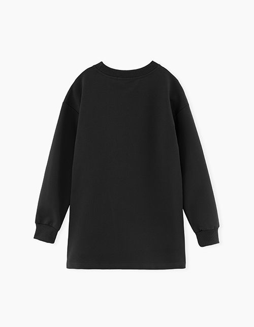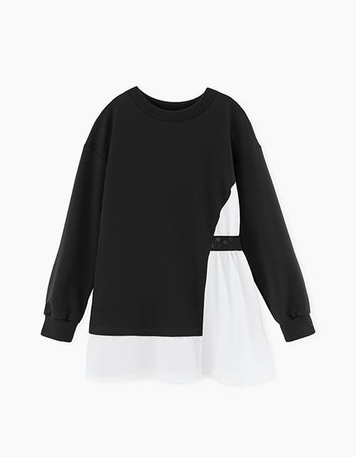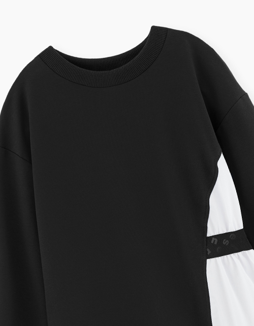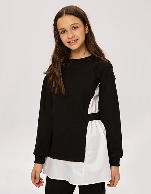 Удлиненный черный джемпер-обманка для девочки. Трендовая школьная модель для повседневного образа. Модель декорирована эластичной лентой с принтом.