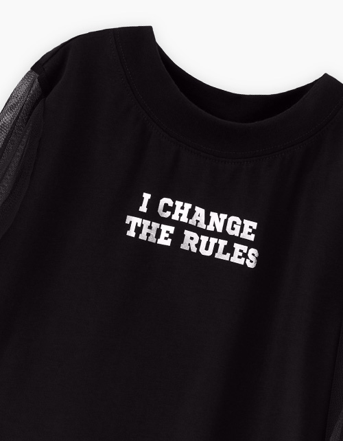 Стильный укороченный чёрный лонгслив для девочки. Модель прилегающего силуэта. Горловина из эластичной рибаны. Комбинация материалов: кулирная гладь и мягкое сетчатое полотно. Лонгслив декорирован авторской трансферной печатью.
