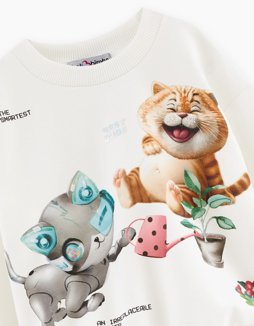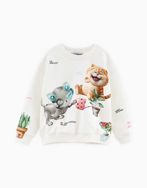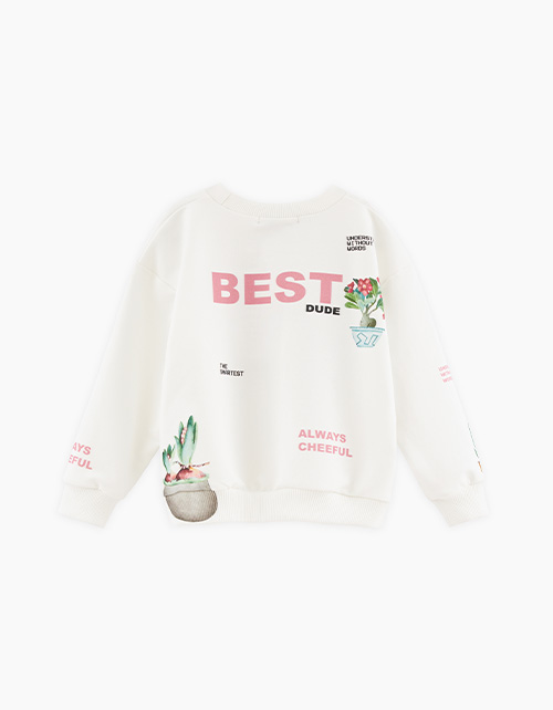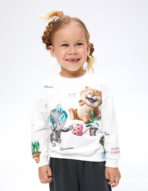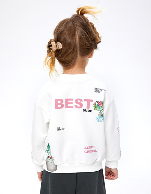 Свитшот оттенка молоко для девочки. Модель прямого объёмного силуэта. Спущенная линия плеча. Воротник-стойка, манжеты и низ изделия из рибаны. Почерковая модель бренда декорирована авторскими принтами.