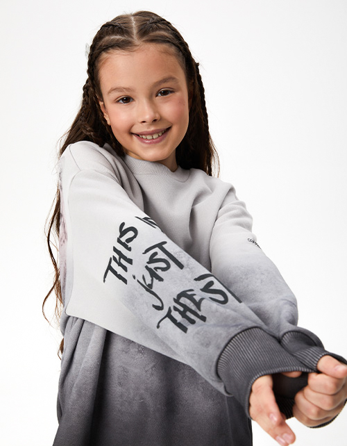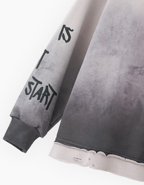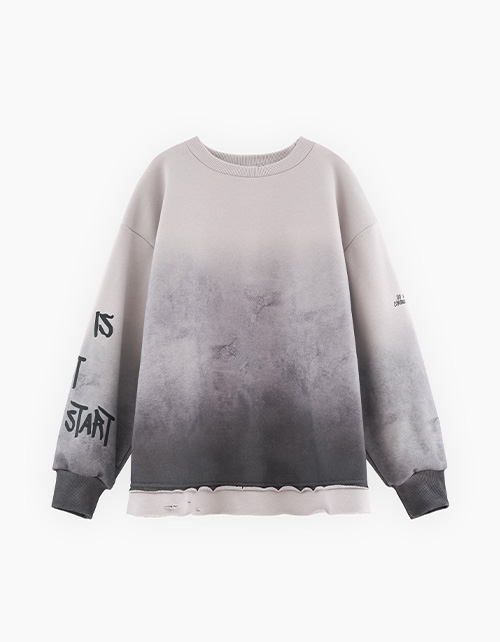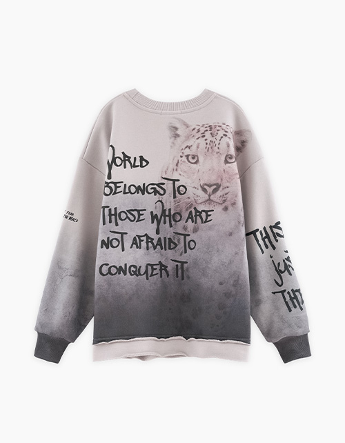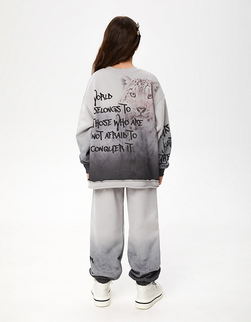 Свитшот оттенка серая дымка из футера с бархатистым эффектом. Модель прямого объёмного силуэта. Спущенная линия плеча. Воротник и манжеты из рибаны. Низ изделия с декоративными прорезями и сырым срезом. Авторские принты, с акцентной спинкой.