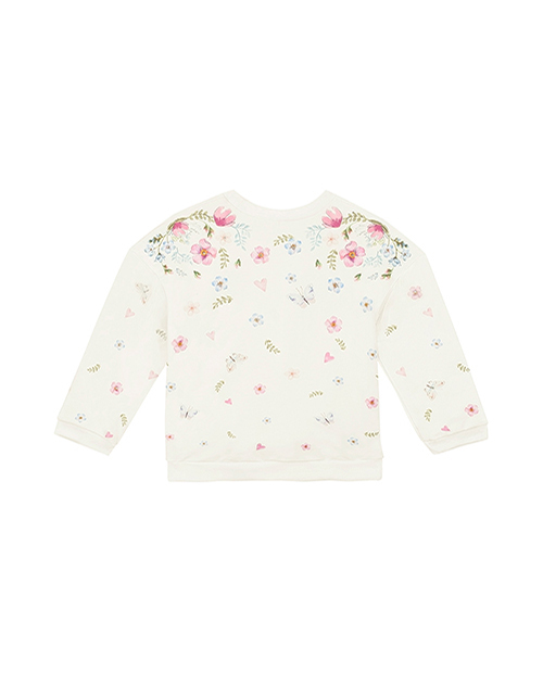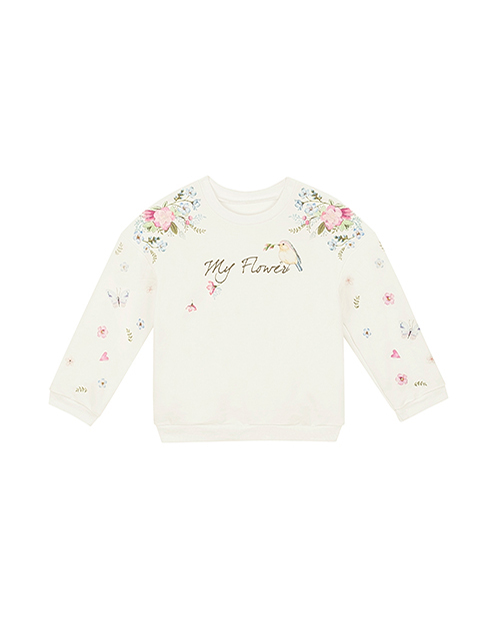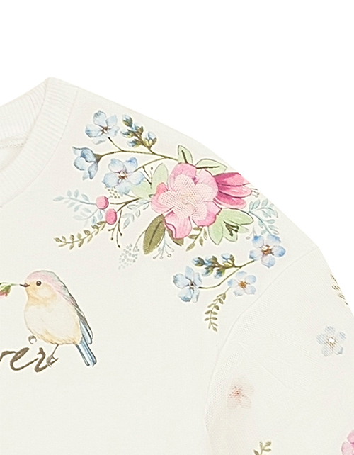 Белый джемпер для девочки с круглым горлом. Дизайнерское оформление "Незабудка", стразы и вставные элементы. Декоративная сетка на рукавах. Воротник и низ из рибаны.