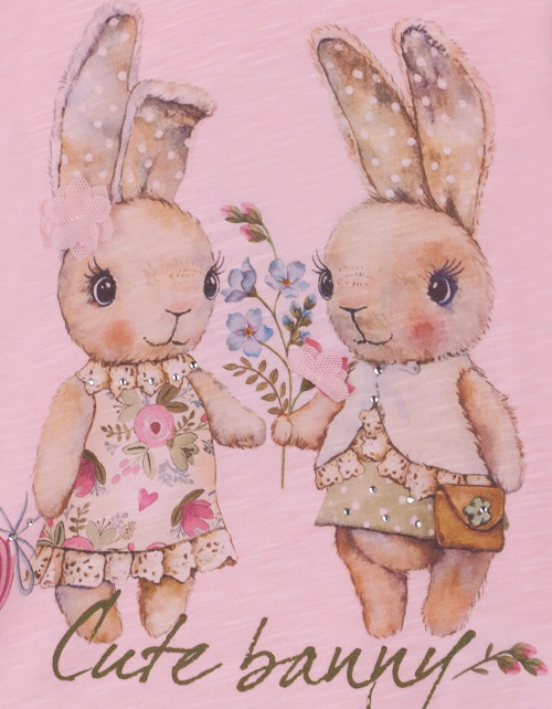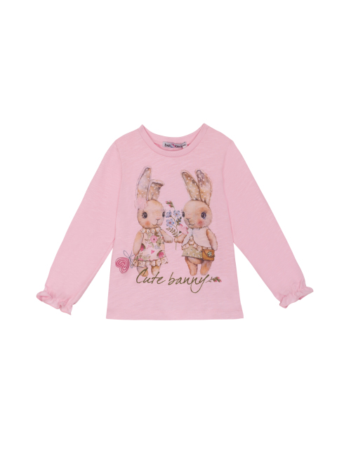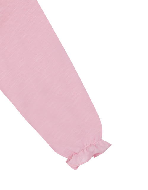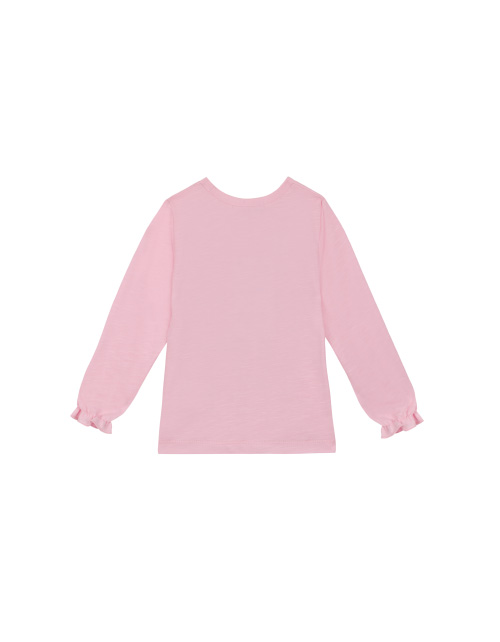 Повседневный розовый джемпер для девочки прямого силуэта с длинным рукавом и круглым вырезом горловины. На лицевой стороне присутствует принт с надписью. Нижняя часть рукавов дополнена оборками.