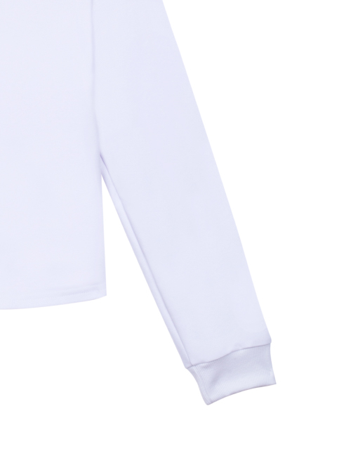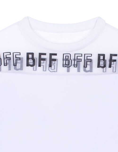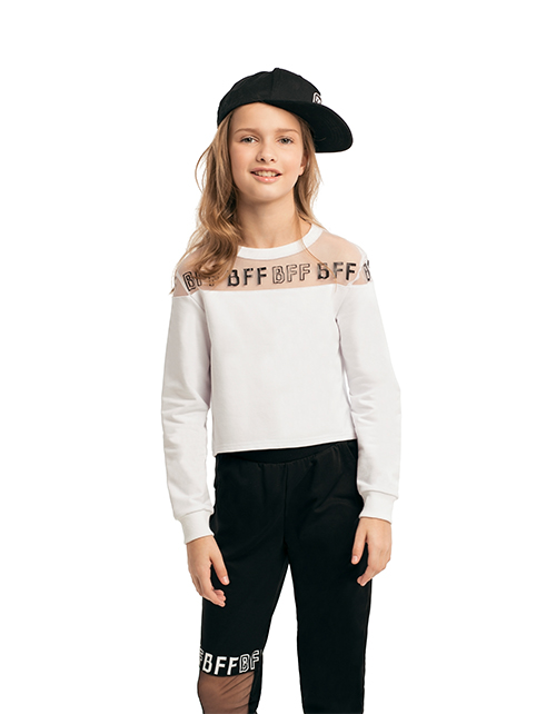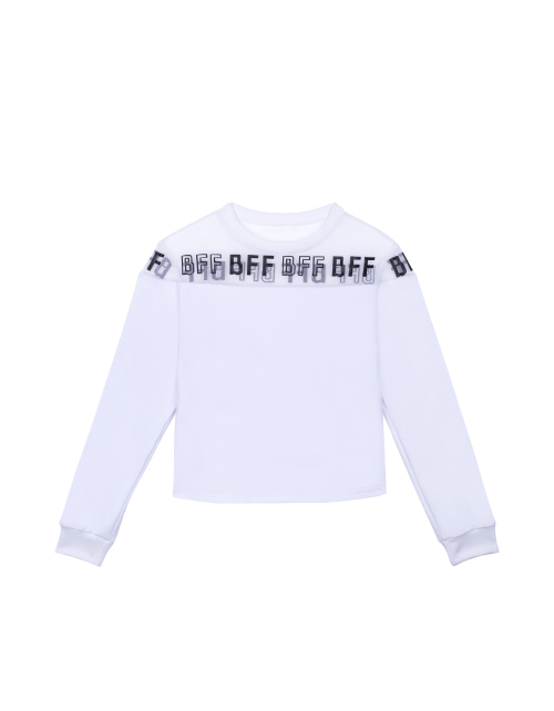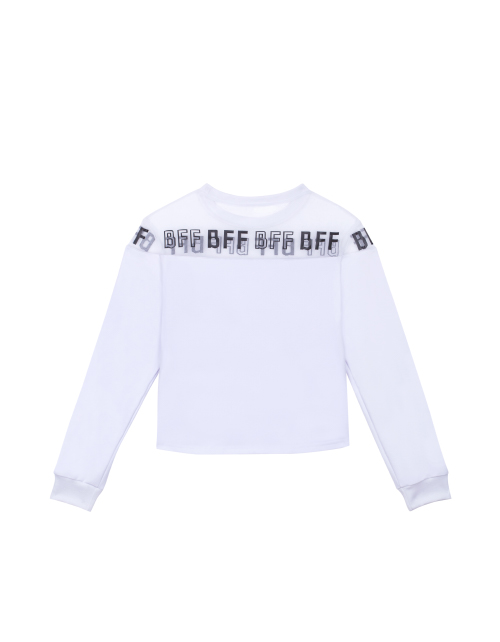 Белый джемпер для девочки с круглым вырезом горловины. Вставка из сетчатого полотна с принтом-надписью в стилистике капсулы "Кот-Арт". Укороченный низ. Манжеты из рибаны.