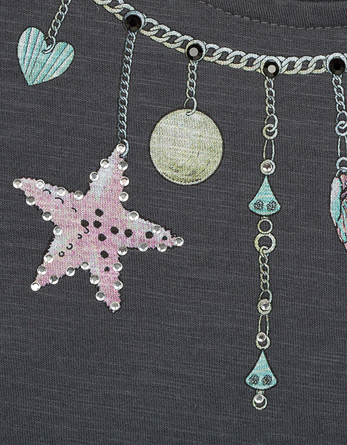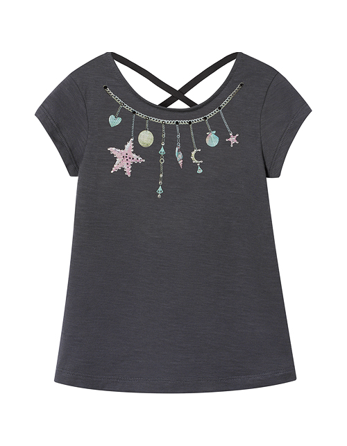 Приятная мягкая маечка с принтом в виде ожерелья из "сокровищ" океанских глубин и оригинальным элементом декора в виде бретелек на спинке. Невероятно комфортная, выполненная из натуральной ткани, она навевает "морское" настроение и незаменима в жаркие ден
