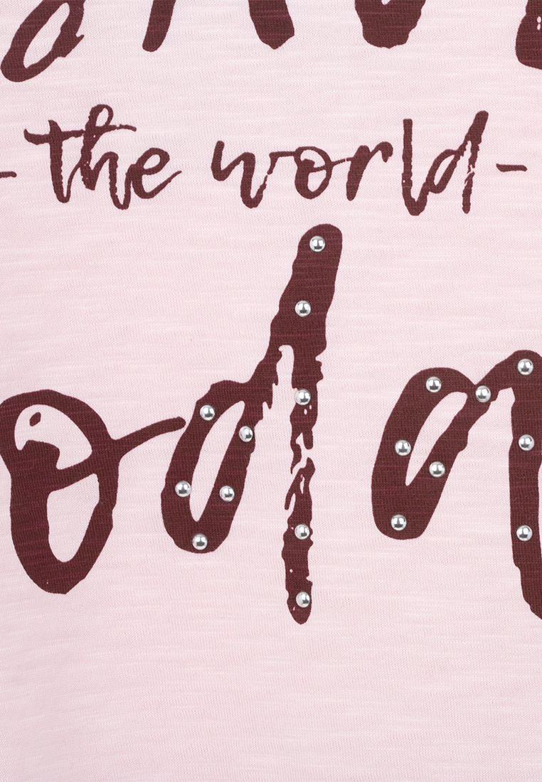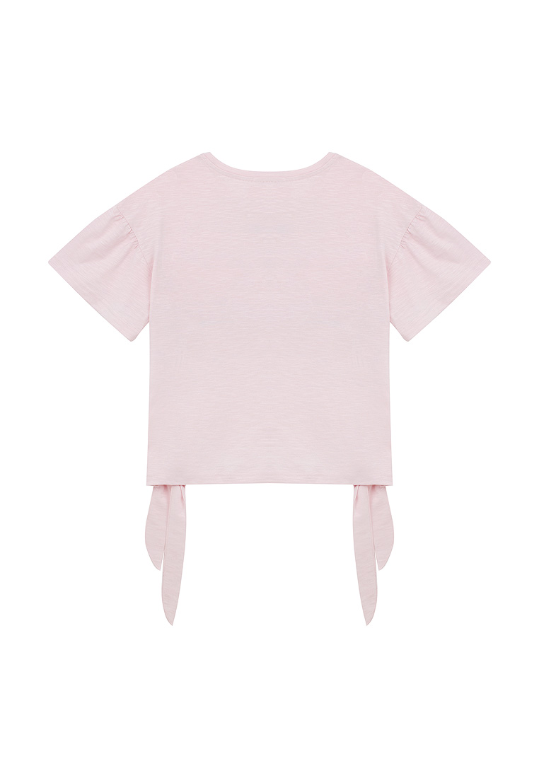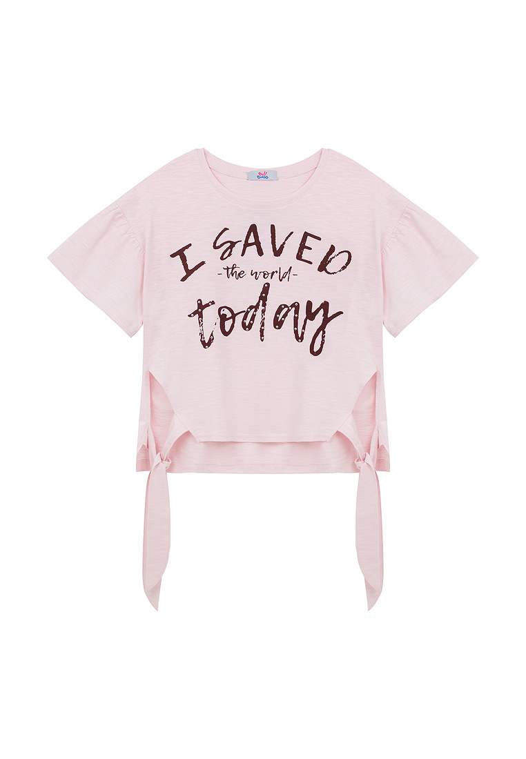 Стильная футболка из мягкой ткани подарит лёгкость и комфорт даже в жаркий день. Модная форма, спущенная линия плеча и разрезы с завязками делают модель оригинальной. Шрифтовой принт с надписью "Я спасу этот мир сегодня" подчеркнёт индивидуальность девочк