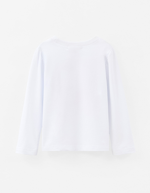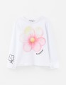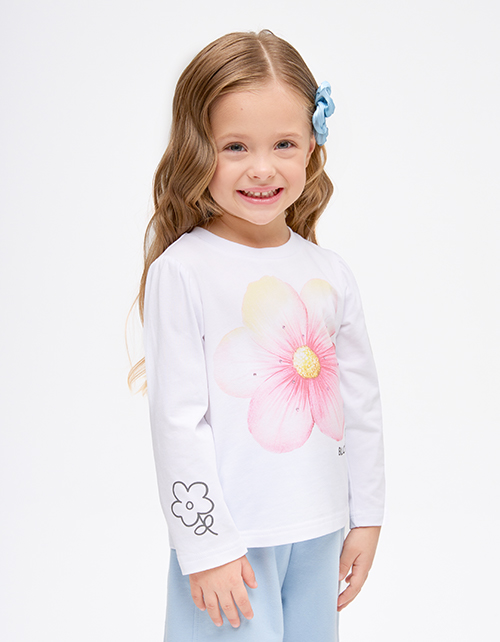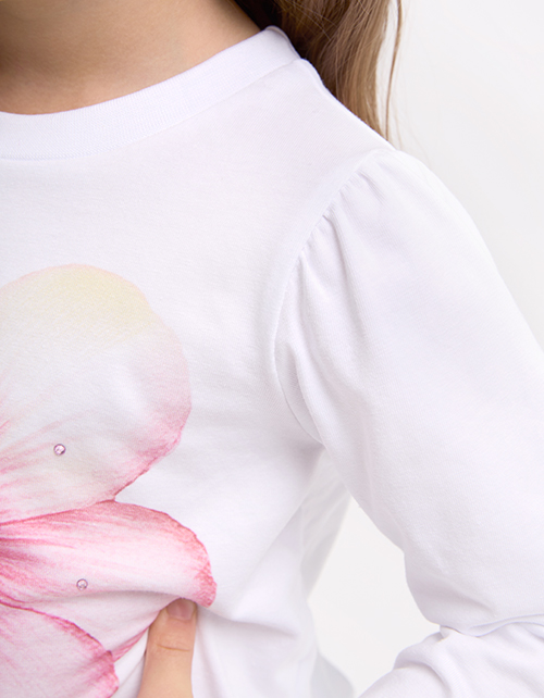 Лонгслив для девочки. Прямой силуэт обеспечивает комфорт. Рукава с романтичной сборкой создают нежный образ. Декор из страз и цифровая печать подчёркивают стиль. Эластичная горловина из рибаны.