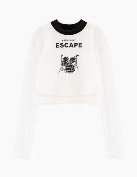 Чёрный нарядный лонгслив из сетки для девочки. Модель полуприлегающего силуэта. Узкий рукав. Изделие с нижним укороченным нераздельным топом из кулирной глади. Лонгслив декорирован авторской композицией из страз.